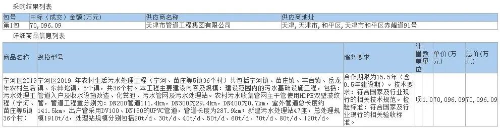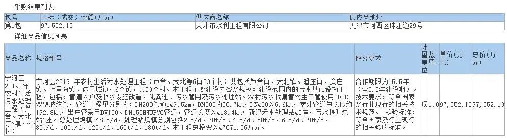 北极星水处理网从天津市政府采购网获悉,天津市宁河区2019年农村生活污水处理工程(宁河、苗庄等5镇36个村)以及宁河区2019年农村生活污水处理工程(芦台、大北等6镇33个村)两大项目分别迎来了中标供应商,两大项目总中标价约16.8亿。