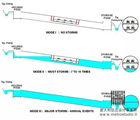 马来西亚也有值得借鉴的地方,在地处热带的吉隆坡,暴雨肆虐的天气经常出现,导致河流泛滥。当地政府在2007年筹资4亿多美元修造的暴雨管理和道路隧道系统(SMART Tunnel),很大程度上为吉隆坡的居民缓解了一下雨就道路积水,造成堵车的局面。这个道路系统的储水容量为300万立万米,项目设计按照百年一遇的降雨强度而建造,其中的防暴雨排水道绵延达9.7公里,内部直径13.2米。工程之大,运作之高效,令人叹为观止。美国的探索频道甚至为这个工程专门做了一集纪录片,名字就叫《“聪明”的隧道》。
