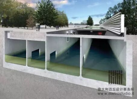 在鹿特丹市中心,“水广场”顺地势而建,由形状、大小和高度各不相同的水池组成,水池间有渠相连。平时是市民娱乐休闲的广场,人们可以在广场上尽情地踢球、溜冰;而当暴雨来临时,“水广场”则可瞬间变身,成为一个防止积水的排水系统。由于雨水流向地势更低洼的水广场,街道上就不会有积水。所有的水池就像一张循环往复的网,雨量大时,从大水池中分流到沟渠;雨量小时,水又回流入大水池。雨水不仅可在水池间循环流动,还能被抽取储存为淡水资源。