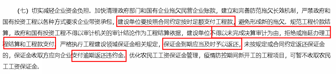 (七)切实减轻企业资金负担。加快清理政府部门和国有企业拖欠民营企业账款,建立和完善防范拖欠长效机制,严禁政府和国有投资工程以各种方式要求企业带资承包,建设单位要按照合同约定按时足额支付工程款,避免形成新的拖欠。规范工程价款结算,政府和国有投资工程不得以审计机关的审计结论作为工程结算依据,建设单位不得以未完成决算审计为由,拒绝或拖延办理工程结算和工程款支付。严格执行工程建设领域保证金相关规定,保证金到期应当及时予以返还,未按规定或合同约定返还保证金的,保证金收取方应向企业支付逾期返还违约金。优化农民工工资保证金管理,疫情防控期间新开工的工程项目,可暂不收取农民工工资保证金。