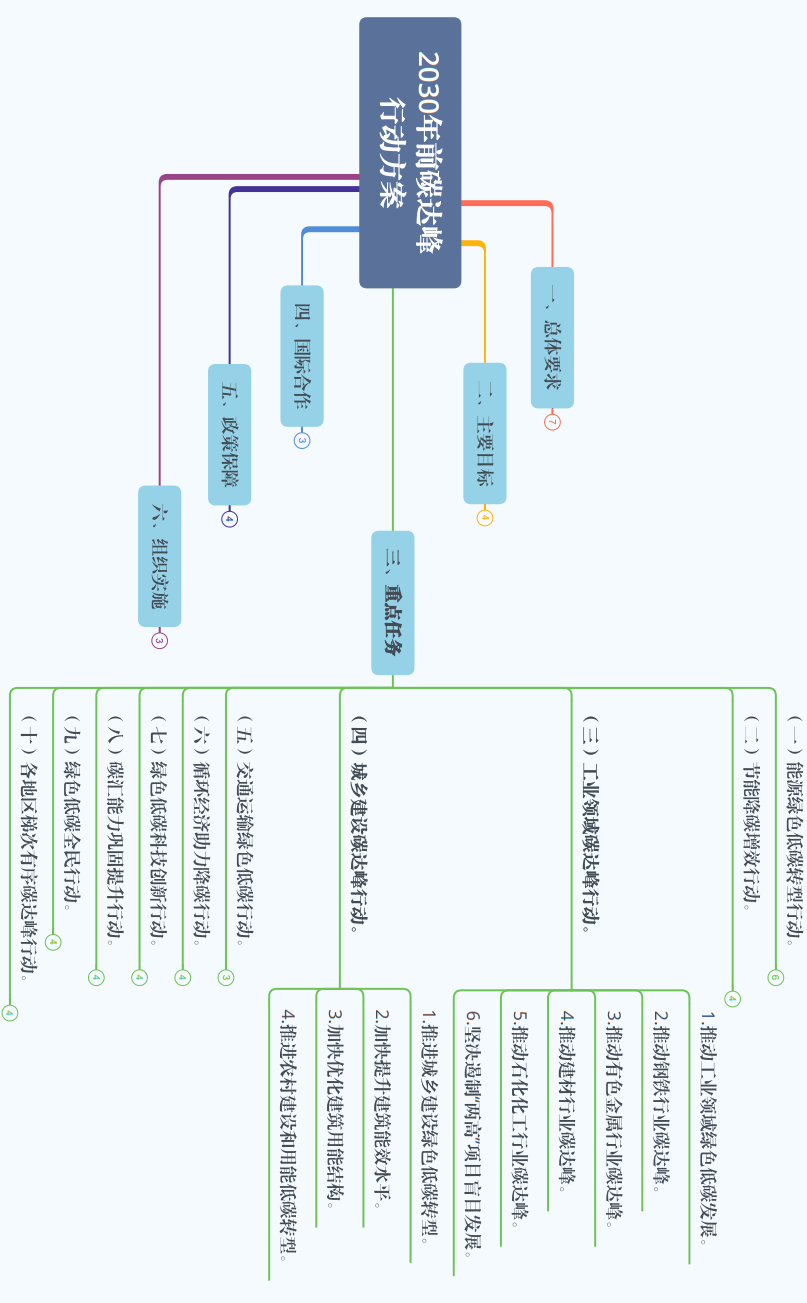 2021年10月26日,国务院向各省、自治区、直辖市人民政府,国务院各部委、各直属机构印发了《2030年前碳达峰行动方案》。该方案从六大方面部署了扎实推进碳达峰行动相关工作,其中第三部“重点任务”中涉及能源转型、工业行业、城乡建设、交通运输、循环经济等“碳达峰十大行动”,共53个具体任务,将碳达峰贯穿于经济社会发展全过程和各方面。在此基础上,国家长江中心梳理了该方案的思维导图,供大家参考。