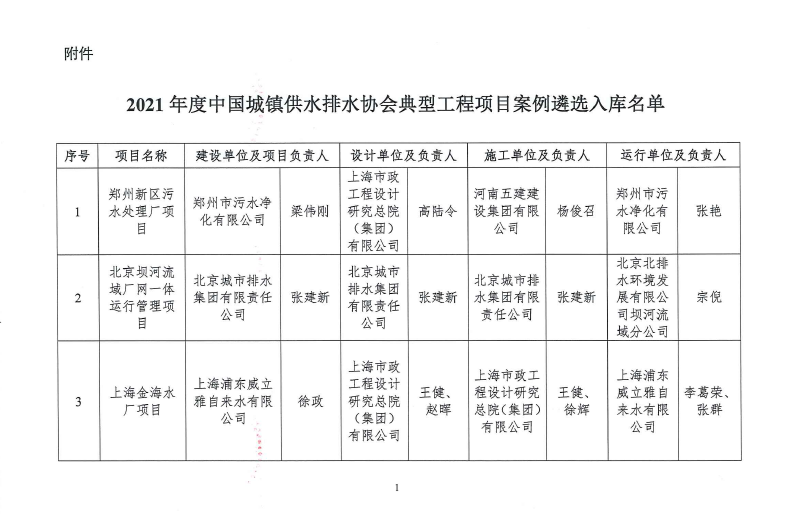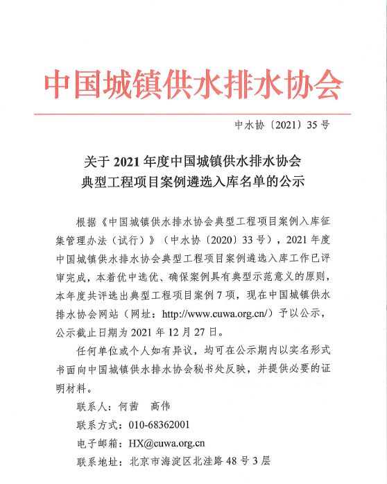 关于2021年度中国城镇供水排水协会典型工程项目案例遴选入库名单的公示