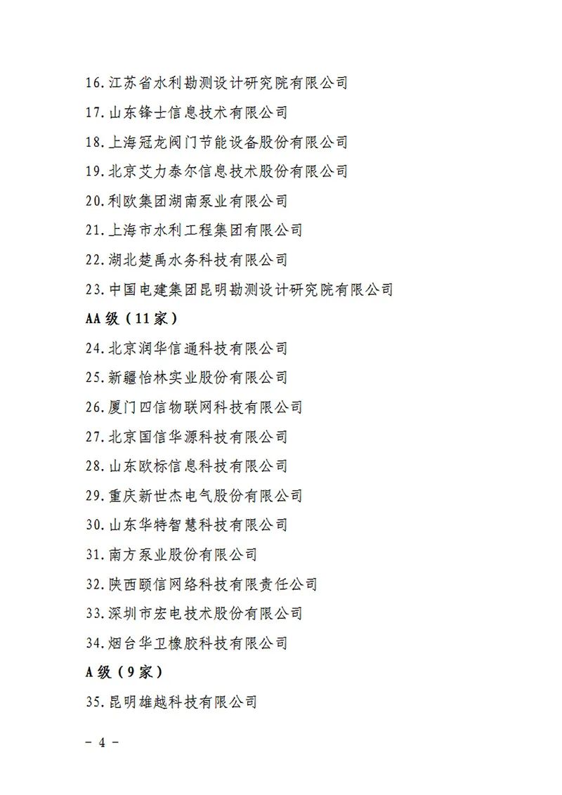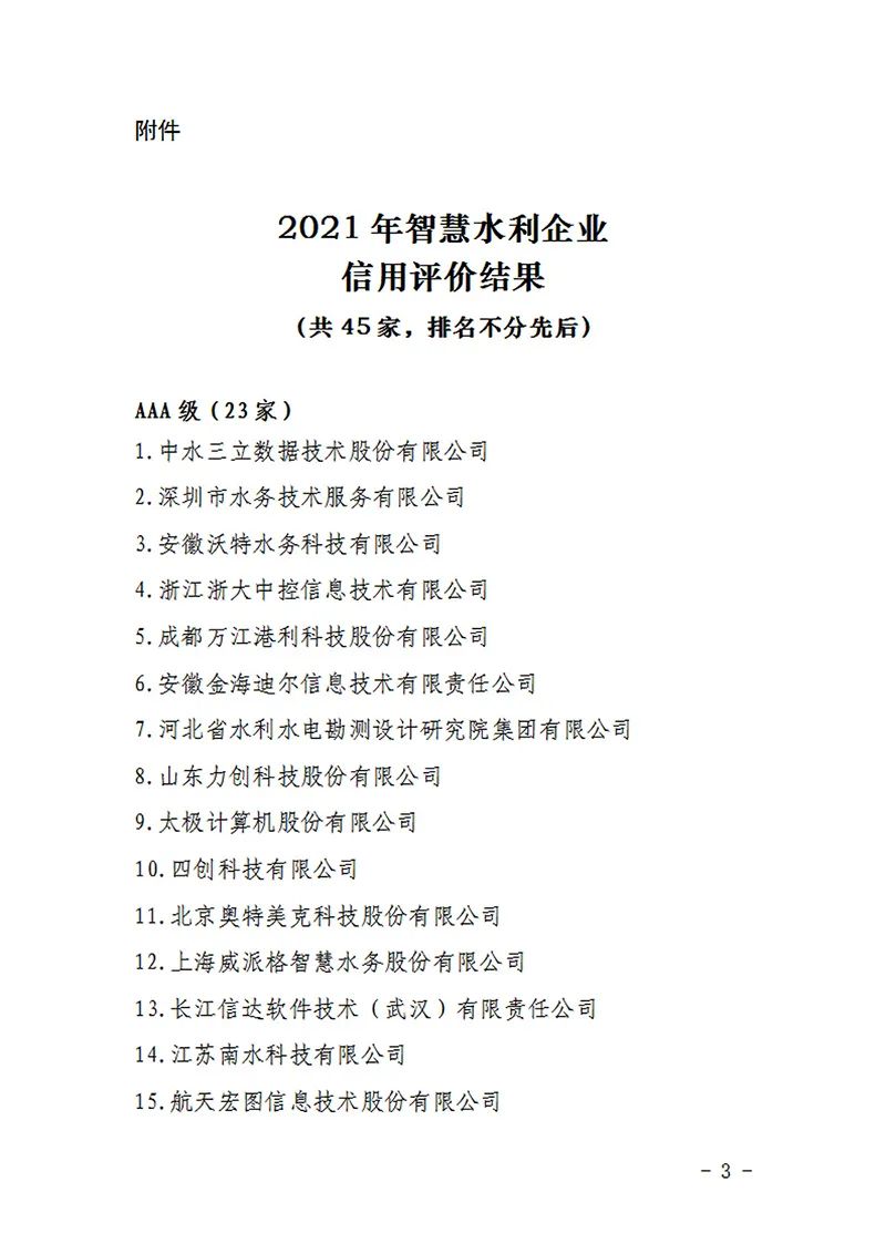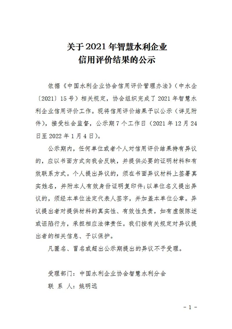 2021年智慧水利企业信用评价结果公示