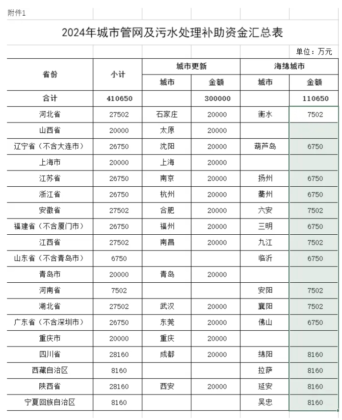 一、下达你省(区、市)2024年城市管网及污水处理补助资金预算指标(项目编码10000013Z135060079040),用于支持系统化全域推进海绵城市建设示范、实施城市更新行动。具体预算金额见附件。支出列2024年政府收支分类科目“211.节能环保支出”。