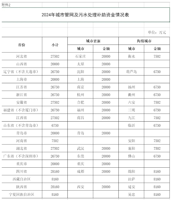 近日,国家财政部下达2024年城市管网及污水处理补助资金预算的通知,用于支持系统化全域推进海绵城市建设示范、实施城市更新行动。